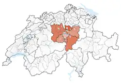 The country of Switzerland is federally organized into 26 cantons, which are the primary sub-divisions of the country.[5] For statistical purposes, the Federal Statistical Office organizes the country into broader level sub-divisions based on cardinal directions. These are classified as a NUTS-2 statistical regions of Switzerland, and incorporate various cantons within it.[6][7] It encompasses the cantons of Lucerne, Uri, Schwyz, Obwalden, Nidwalden, Zug.[7]