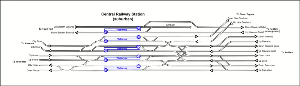 - ^ Platforms 13 and 14 will be reinstated by the project conclusion, but Platform 15 will be removed to provide space for ventilation stacks and platform extension. Central Station Archived 21 April 2017 at the Wayback Machine Sydney Metro.