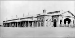 The Second Sydney Terminal was a more substantial brick station building, initially with two platforms. The second station building was constructed on the site of the first station, the main hall spanning the up and down mainlines. Separate platforms and facilities were provided for arriving and departing passengers. The new station building appears to have taken three years to complete: the drawings are dated 1871, while the official opening was in 1874. The second station, like the first, was constructed to allow for a future extension of the line into the city, the lines initially extending just far enough past the building to accommodate a steam locomotive.[4]