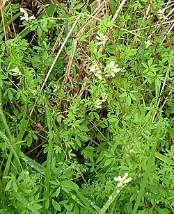 This delicate looking plant is a hairless annual (or occasionally perennial) up to a metre tall with weak, often pinkish, clambering stems. The leaves are pale to medium green, doubly compound, the leaflets being well-stalked and divided into three to five sub-leaflets, and ending in a branching tendril. It blooms between May and September in the UK.[3] The flowers are small, about 6 mm (0.24 in) long,[3] pale creamy-yellow, in short axilliary spikes. Each flower is elongated and tubular with a lip and spur and stamens in two bundles. The seed pods are short, usually narrowing between the two seeds.[4]