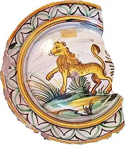 In the "new" Cerreto, there was a true ceramists’ quarter located near the Cerreto Sannita Cathedral. During the renovation of several buildings in that area, remains of kilns for firing terracotta and ceramics were found.[7] In this "ceramists’ insula," there were the workshops of Francesco Iadomaso, a Cerreto native, and Carlo Coluccio from Campobasso. In the same area was the workshop of Nicolò Russo, a master faenzaro who moved from Naples in 1693. Many young apprentices worked in his workshop, becoming the main figures of Cerreto ceramics in the 18th century: Domenico Marchitto, Santi Festa, Melchiorre Cerri, Nicola and Crescenzo Petruccio, Nicola Marchitto, Salvatore Paduano, and Giuseppe Paolino. Russo created numerous works in Cerreto Sannita, including several floorings in religious buildings.[5]