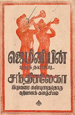 "Naattiya Kuthirai", not originally part of the film, was added during final production. Sundari Bai spent over a month rehearsing the song.[61] M. D. Parthasarathy was the sole singer of "Aathoram Kodikkalam" and co-singer of "Naattiya Kuthirai".[68] J. Cooling Rajaiah played accordion and piano in the film's gypsy song.[69] The circus chorus was adapted from "The Donkey Serenade" in Robert Z. Leonard's 1937 film, The Firefly.[70] Vasan offered most of the songs on the Hindi soundtrack to Uma Devi, who later became popularly known as Tun Tun. She initially hesitated, feeling that "[they] were beyond her capabilities", but was supported by Rajeswara Rao, who "worked hard on her".[71] "Sanjh Ki Bela", from the Hindi soundtrack, is loosely based on "Sanjh Ki Bela Panchhi Akela" from Jwar Bhata (1944).[72] Chandralekha's music helped make it one of the most-successful Indian musical films of the 1940s,[73] and it "created an atmosphere for a number of music directors influenced by Western music" in Tamil cinema.[74]