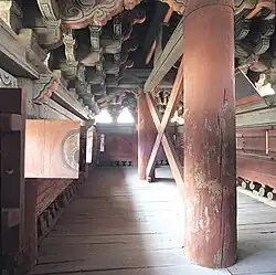 Myeongjeongjeon is the palace's main hall, where state affairs such as meetings with officials and royal banquets were held.[3] First built in 1484, it was burned down during the Japanese invasion of 1592. Rebuilt in 1616, it is the oldest main hall of all the palaces in Seoul.[3] It is smaller than the two-story main halls of Gyeongbokgung and Changdeokgung because it was originally built as the queen's living quarters, rather than as a throne hall.[3] Although it is a simple, one-story structure, Myeongjeongjeon was built on an elevated stone yard that imbued it with the dignity of the main hall. Running through the courtyard in front is a three-level walkway whose centre path was for the king's use only.[3] Surrounding the entire area is a wall-like structure of single-room units which were used by the royal guards or for royal funerals. Myeongjeongjeon is designated as National Treasure 226.
