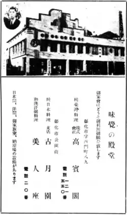 The building housed a restaurant, Kaobinge (高賓閣), which counted Loa Ho and Tu Tsung-ming as frequent patrons.[2][4][5][6] While Kaobinge was in business, the first floor served as a kitchen and staff living quarters.[2] Patrons were seated on the second floor, which included a stage.[2] Due to the Second Sino-Japanese War effort, Kaobinge became less profitable, and was closed roughly five years after it opened. The building was acquired by the Japanese-run predecessor of the Taiwan Railways Administration. Plans to make it a railway hospital were not immediately implemented, and the building alternately housed a dormitory and office building.[2]