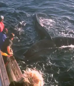 After populations of large whales were decimated by whaling in the last two centuries, several species are rebounding. Channel Islands National Marine Sanctuary is a seasonal home to several species of those large whales. From early spring to late fall, the sanctuary sees increasing numbers of humpback, blue, and fin whales- with seasonally migrating gray whales transiting the sanctuary on their trips between the North Pacific and the lagoons of Baja California. At times, large whales aggregate in tremendous numbers, with as many as 186 unique photo identifications occurring in a single day. Understanding the causes of this aggregation, such as bloom dynamics of the krill the whales feed on, can provide valuable forecasting information to predict where whales are likely to be in the near term.[11] This information in turn could aid in reducing whale-ship interactions. Ongoing work has focused on behavioral responses of large whales to close encounters with large vessels transiting the Santa Barbara Channel. This work is being extended to focus on two problems: how variability in krill depth is key to whale decision making, and how the whales are selecting specific sized prey within pools of mixed-age krill. To get after these questions, sanctuary staff and contractors are combining an ongoing program of tagging large whales with time-depth-location recording tags with systematic mapping of krill fields around the sanctuary. The sanctuary is assisting the work of partners from Cascadia Research Collective and Scripps Institution of Oceanography.