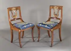 This particular set of twelve (12) Lannuier chairs (referred to as the "James Bosley Set")[1] consisting of 2 Arm chairs and 10 side chairs in the Neoclassical French style was purchased for Bosley's Music room in Baltimore, Maryland. According to Mr. Peter Kenny's Book on Lannuier for the NY Met (pages 133–137) it is believed that James Bosley acquired the set of chairs from Lannuier's client, A.S. Bulloch in Savannah, Georgia.[2][3] Archibald Stobo Bullock and his Wife, Sara Glen built the 'Bulloch-Habersham' house at 229 Barnard Street, Orleans Square in Savannah, Georgia, and filled the new house with a large quantity of furniture that had been shipped to Bulloch from Charles-Honore'Lannuier shortly before his death. Due to the Great Savannah Fire of 1820, Bulloch was forced to sell his possessions and eventually his house. James Bosley purchased the set which he used to furnish the music room in his new townhouse on Calvert Street in Baltimore.