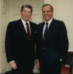 ![]() Gillesip Jr (right) with President Ronald Reagan, 1987 | |