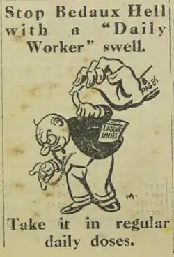 "Stop Bedaux Hell with a "Daily Worker" swell." A cartoon attacking the Bedaux B in the Daily Worker, 1935.