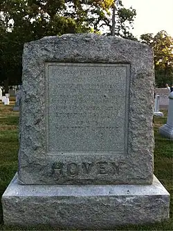 After the war, Hovey and his wife lived in Washington, D.C. Having once briefly studied law, he became a successful pension lobbyist and practicing attorney. He died in Washington, D.C., on November 17, 1897, and was buried with full military honors in Arlington National Cemetery.[1]