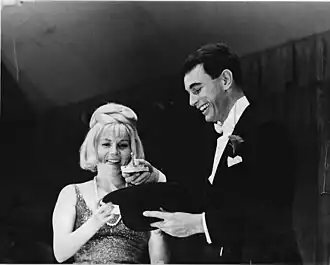 Charles Robinson demonstrating his skill as a magician, with the assistance of his wife Joan, at a late 1960s–early 1970s fundraiser.