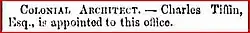 In December 1859, Tiffin became Colonial Architect for the colony of Queensland, Australia.[5]