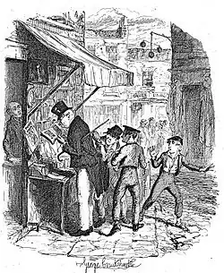 ![]() Charley (centre) and the Dodger steal Mr Brownlow's handkerchief at the bookstall. Illustration by George Cruikshank. | |