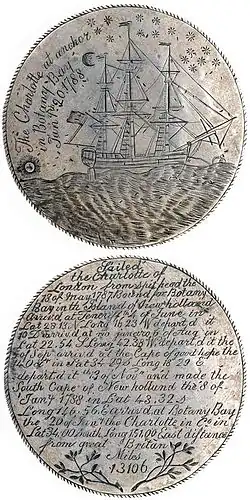 The Charlotte Medal is a silver medallion, 74 millimetres (2.9 in) in diameter, depicting the voyage of the convict transport Charlotte, with the First Fleet, to Sydney, New South Wales, Australia. Its obverse depicts the ship and the reverse is inscribed with a description of the journey. Struck by convict Thomas Barrett upon arriving in Botany Bay aboard Charlotte in January 1788, the medal is said to be the first work of Australian colonial art.[1] Within a month, Barrett became the first person to be executed in the new colony.