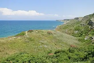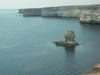 The Charming Harbor National Nature Park or Tarkhankut National Park (Ukrainian: Національний природний парк «Чарівна гавань», romanizedNatsionalnyi pryrodnyi park «Charivna havan'»; Russian: Природный парк «Тарханкутский», romanizedPryrodny park «Tarkhankutsky») covers a coastal sector of the Tarkhankut Peninsula (itself a part of the Crimean peninsula) on the Black Sea. The national park protects and exhibits steppe landscape as it descends to the seacoast in a semi-arid environment and with dramatic cliffs and rock formations. The park is in the administrative district of Chornomorske Raion.[1][2]