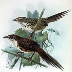 - Bowdleria punctata (Fernbird) / B. rufescens (Chatham Islands fernbird) Artwork by Johannes Keulemans, 1873