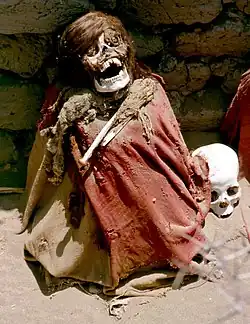 The nearby site of Estaquería may provide clues to the remarkable preservation of the numerous bodies in these cemeteries. At that site, archeologists found wooden pillars initially thought to have been used for astronomical sightings.[5] However, it is now believed that the posts were used to dry bodies in a mummification process.[2] This may account for the high degree of preservation seen in thousand-year-old bodies which still have hair and the remains of soft tissue, such as skin.
