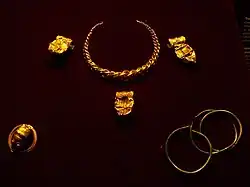 The jewellery consists of a necklace, three pendants and a fibula (brooch), all made from gold.[2] The fibula is of particular interest because it is decorated with a human head in the style of the La Tène culture, associated with the Celts, showing Celtic or Celtiberian influence on the Iberian societies of the east coast of the peninsula.[3]