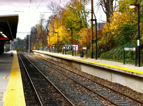 Chestnut Hill West station is a SEPTA Regional Rail station in Philadelphia, Pennsylvania. Located at 9 West Evergreen Avenue in the Chestnut Hill neighborhood, it serves the Chestnut Hill West Line. It was originally built by the Philadelphia, Germantown and Chestnut Hill Railroad between 1883 and 1884, and later acquired by the Pennsylvania Railroad. In 1918, when the line was electrified, the station was rebuilt to accommodate the upgrade.[5]
