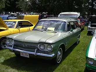 The Chevrolet Corvair Lakewood is a four-door station wagon produced by Chevrolet for the 1961 model year. Chevrolet dropped the "x-wood" names for their station wagon models at the end of 1961 so the 1962 Corvair Station wagons do not continue the Lakewood name. In appearance, and technical respects it resembled the Volkswagen Type 3 Squareback, but power came from the Corvair's rear-mounted Chevrolet Turbo-Air 6 engine with 145 cu.in. displacement which developed 80 bhp (60 kW) at 4,400 rpm. The station wagon Corvairs were built on the same unibody as other sedan Corvairs with a 108 in. wheelbase. Standard transmission was a 3-speed manually shifted transaxle.