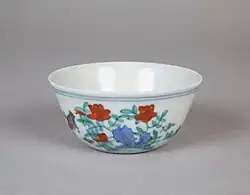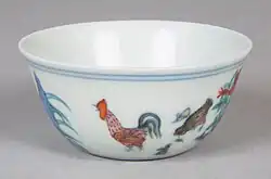 A Chicken Cup is a bowl-shaped vessel made of Chinese porcelain painted in the doucai technique. Chicken cups were created during the Ming dynasty (1368–1644), during the Chenghua Emperor's reign (1465–1487) in China, and originally functioned as a vessel to drink wine from. Chenghua Chicken Cups were created in an imperial kiln in the Jingdezhen porcelain factory, in Southern China.[1] The Emperor Chenghua had the Chicken Cup created in the 15th century as an act of devotion for his empress mother who was recorded to have an appreciation for small objects and valued a simple design taste.[2]