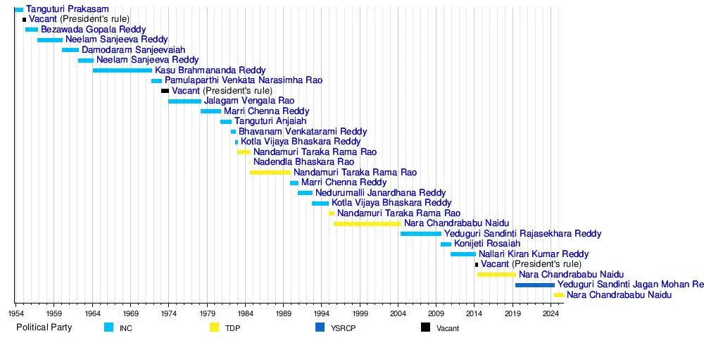 N. Chandrababu NaiduY. S. Jagan Mohan ReddyN. Chandrababu NaiduVacantKiran Kumar ReddyKonijeti RosaiahY. S. Rajasekhara ReddyN. Chandrababu NaiduN. T. Rama RaoKotla Vijaya Bhaskara ReddyN. Janardhana ReddyMarri Chenna ReddyN. T. Rama RaoN. Bhaskara RaoN. T. Rama RaoBhavanam Venkatarami ReddyT. AnjaiahMarri Chenna ReddyJalagam Vengala RaoVacantP. V. Narasimha RaoKasu Brahmananda ReddyNeelam Sanjeeva ReddyDamodaram SanjeevaiahNeelam Sanjeeva ReddyBezawada Gopala ReddyVacantTanguturi Prakasam