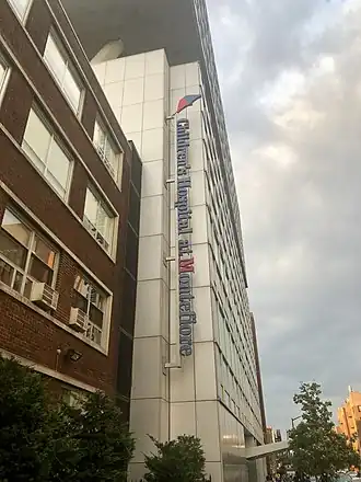 The Children's Hospital at Montefiore (CHAM) is a nationally ranked pediatric acute care children's teaching hospital located in the Bronx, New York. The hospital has 193 pediatric beds[2] and is affiliated with the Albert Einstein College of Medicine.[3] The hospital is a member of the Montefiore health network and is the only children's hospital in the network. The hospital provides comprehensive pediatric specialties and subspecialties to infants, children, teens, and young adults aged 0–21[4][5] throughout the Bronx and New York state. Children's Hospital at Montefiore also sometimes treats adults that require pediatric care.[6] While CHAM does have a pediatric emergency department, they do not have a pediatric trauma center and sends all pediatric trauma cases to the nearby Jacobi Medical Center's level II pediatric trauma center.[7] The Children's Hospital at Montefiore is one of the largest providers of pediatric health services in New York state. The hospital is attached to Montefiore Medical Center and is affiliated with the Ronald McDonald House of New York.[8]