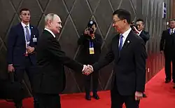 President of Russia Vladimir Putin shaking hands with Han Zheng at the IV China-Russia Expo in Harbin