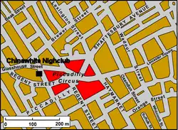 Map displaying approximate location near Piccadilly Circus of the original Chinawhite nightclub in central London