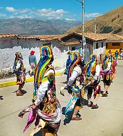 • Cchuchu: The most important of all the costumes in the parades. Cchuchu was - unlike most others - originally created in Chinchaypujio. It was inspired by a dream, in which the Holy mother allegedly asked for a dance involving trembling gestures and leather. The Cchuchu dancers carry willow branches, dress in white and tremble during their dance ritual.[13]