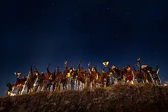 • Q'Apaq Negro: A colonial-era dance, mostly performed by men, remembering the period of slavery for Afro-Peruvians. It features locals with round hats, scarfs around their waistline, blue pants, black masks, black gloves and small Sceptres with black hands. The dance symbolizes both the struggles of slavery; its colorful ornaments and shiny stones represent the strength of black people in colonial Peru gaining liberty.[14]