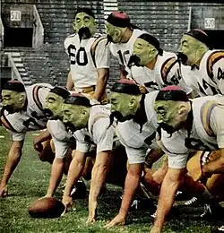 The Bandits were hugely popular among fans. In 1958, a local restaurant gave away free Asian conical hats with meals and sold over 1,400 of them in a single day.[2] A disk jockey wrote a song about the unit, which the LSU band played whenever the unit took the field.[2] A photograph by George Silk of the Bandits dressed in their football uniforms and wearing masks that resembled aged Chinese men were featured in the October 12, 1959 issue of LIFE.[18] They live on today in the "Tiger Bandits" song, played by the LSU marching band after the defense stops an opponent on third down or forces a turnover. LSU fans bow to the defense as the song is played.[19]