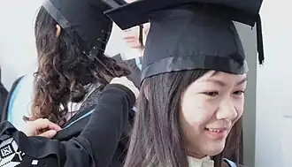 The current modernized academic dress of China is very different from the ancient form. The current forms have been standardized since 1994.[3] Gowns are closed at the front and are colored depending on the level of the degree; typically, black for bachelors, blue for masters and a combination of scarlet and black for doctoral gowns. The hood is a simple piece of triangular cloth which is colored depending on the faculty. The mortarboard is similar to American ones, except they may have string at the back of the skullcap to tie and secure the cap to the head.