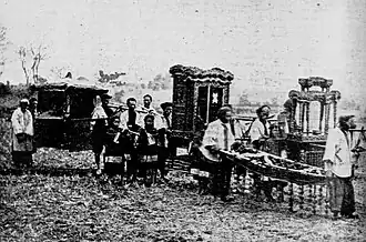 Chinese funeral rituals comprise a set of traditions broadly associated with Chinese folk religion, with different rites depending on the age of the deceased, the cause of death, and the deceased's marital and social statuses.[1] Different rituals are carried out in different parts of China and many contemporary Chinese people carry out funerals according to various religious faiths such as Buddhism or Christianity. However, in general, the funeral ceremony itself is carried out over seven days, and mourners wear funerary dress according to their relationship to the deceased.[2] Traditionally, white clothing is symbolic of the dead, while red is not usually worn, as it is traditionally the symbolic color of happiness worn at Chinese weddings.[3] The number three is significant, with many customary gestures being carried out three times.