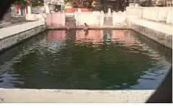 The tank is rectangular in shape, made of laterite measuring 22.40 m in length and 11.20 m in breadth with a depth of 3.0 m. The tank is fed by a natural spring with waters from underground. As a result of this, water level is constant throughout the year. There is an outlet in the eastern wall to discharge excess water.