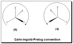 In the CIP or R/S convention, or sequence rule, the configuration, spatial arrangements of ligands/substituents around a chiral center, is labeled as either "R" or "S".[18][2] This convention is now almost worldwide in use and become a part of the IUPAC (International Union of Pure and Applied Chemistry) rules of nomenclature. In this approach: identify the chiral center, label the four atoms directly attached to the stereogenic center in question, assign priorities according to the sequence rule ( from 1 to 4), rotate the molecule until the lowest priority (number 4) substituent is away from the observer/viewer, draw a curve from number 1 to number 2 to number 3 substituent. If the curve is clockwise, the chiral center is of R-absolute configuration, "R" (Latin, rectus = right). If the curve is counterclockwise, the chiral center is of S-absolute configuration, "S" (Latin, sinister = left). Refer to figure, the Cahn-Ingold-Prelog rule.