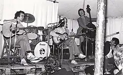 Newman (left) performs with his group at the 1977 Cambridge Folk Festival, U.K., while Diz Disley (extreme right) watches on. Musicians L-R: Chris Newman, guitar; Mike Ring, guitar; Henry Davies, double bass.