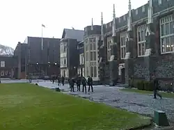 Christ's College moved to its present site in 1856, with 35 pupils and a staff of three. This location, adjacent to the Government Domain (now Hagley Park), provided the college with room to expand, and the school gradually began to acquire additional buildings. The first of these building were wooden, providing homes for the staff and their families and an increasing number of boarders. By 1863, Big School, the first of the stone buildings, had been built on the west side of the quadrangle in which all classes were taught (in present-day it is the school's library with additions by Sir Miles Warren and currently the oldest educational building still in use in New Zealand), followed in 1867 by the Chapel.[2] The school developed slowly around this central quadrangle, and today the 'quad' is treated with reverence, and therefore students are not permitted to walk on it, only staff members and permitted visitors. The Cathedral Grammar School used to be the Lower School of Christ's College when it struggled financially from 1895 to 1922.