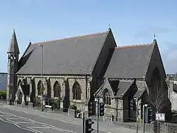 The church roof originally had vents to allow fumes from its gas lighting to escape, but these have been removed.[7] Early in the 20th century, a carved timber reredos was added inside.[12] A World War I memorial was erected next to the entrance porch soon after the war ended,[7] and the original north transept was later converted into a vestry to form a memorial to victims of World War II.[12] The church had been damaged by wartime bombing in February 1943, although it was soon repaired. The distinctive corner turret was comprehensively restored in 2003: work was carried out on its clock, bell, spire and the weathervane.[13]