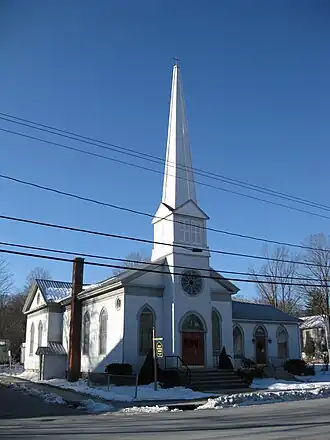 Christ Lutheran Church and Parsonage, originally the German Evangelical Lutheran Church of Ellenville, is a historic Lutheran church and parsonage located at Ellenville, Ulster County, New York. The church was built in 1862 in the Greek Revival style. It was moved, enlarged, reoriented, and completely remodeled in 1903–1904 in the Gothic Revival style when moved to its present location. It is a roughly L-shaped building, with a T-shaped main block consisting of a 1+1⁄2-story, gable-roofed front block and 1+1⁄2-story gable-roofed rear block. Appended to it is a 1-story addition. It features a two-tiered, square bell tower, central front entrance flanked by blind bays, and Gothic arched stained glass windows. The parsonage is a 2-story, three-bay-wide, Greek Revival–style brick dwelling built about 1850.[2]