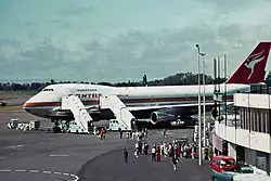 A 1,400 ft (427 m) southwest extension to runway 02/20 opened in November 1963, extending the runway to 8,000 ft (2,438 m) and providing for commercial jet operations.[13] In April 1965, scheduled jet services were launched by Qantas to Sydney using the Boeing 707.[14]