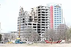 Prior to the earthquake, the site was occupied by the PricewaterhouseCoopers building. The 21-storey mixed-use commercial and retail building was constructed in 1990, and included an underground car park with 158 spaces. During the earthquakes the building sustained significant structural damage, and it was deemed uneconomic to repair in October 2011.[1] The owners were Kiwi Property Group Ltd, which also operates Northlands Shopping Centre. The group received an insurance payout.[2] Demolition began in March 2012 using the "cut-and-crane" method.[3]