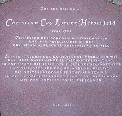 On the two-hundredth anniversary of the date of Hirschfeld's death, Kiel renamed a small green area on the edge of his former tree nursery 'Hirschfeld-Blick' (Hirschfeld Square), in which a small memorial plaque to him was placed in 1997. The Kieler Bürgerstiftung has been awarded to public gardens every two years since 2007.