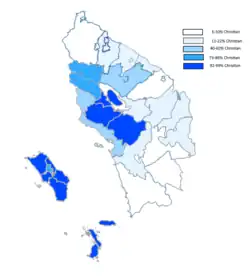 Among Indonesian provinces in 2018, North Sumatra reported the second highest number of Christians (4.7 million) or 16.5% of Christians within Indonesia. North Sumatra had the seventh-highest percentage (among religions reported in the province) of Christians (31.6%), including the sixth-highest percentage of Protestants (27.3%), and 4.3% Catholic population.[9] However, this varies by regency—the Nias islands are 95%+ Christian of Nias ethnicity, and all of the areas surrounding Lake Toba have large Christian populations of the Batak Toba, Karo and Pakpak ethnic groups. Apart from this, most other parts of North Sumatra have a significant Christianity percentage (around 20 to 40%), with the exception of Langkat, in the northeast coast, Asahan on the east coast, and the Mandailing regencies in the south which are Muslim majority (below 10%).