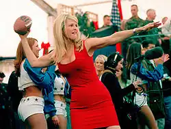 Brinkley winds up to throw an autographed football into the audience during a USO show in the Eagle Sports Complex at Tuzla Air Base, Bosnia and Herzegovina (December 22, 1999)