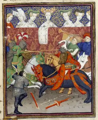 In the beginning of 1405, France was on the verge of a full-scale civil war.[33] In 1407 John I of Burgundy, also known as John the Fearless, plunged France into a crisis when he ordered the assassination of Louis of Orléans.[14] The Duke of Burgundy fled Paris when his complicity in the assassination became known,[33] but was appointed regent of France on behalf of Charles VI in late 1408 after his military victory in the Battle of Othee.[33][34] It is not certain who commissioned Christine to write a treatise on military warfare,[35] but in 1410 Christine published the manual on chivalry, entitled Livre des fais d'armes et de chevalerie (The Book of Feats of Arms and of Chivalry).[36] In early 1411, Christine was paid 200 livres from the royal reasury for the book.[32] In the preface Christine explained that she published the manual in French so that it could be read by practitioners of war not well versed in Latin. The book opened with a discussion of the just war theory advanced by Honoré Bonet. Christine also referenced classical writers on military warfare, such as Vegetius, Frontinus and Valerius Maximus.[37] Christine discussed contemporary matters relating to what she termed the Laws of War, such as capital punishment, the payment of troops, as well as the treatment of noncombatants and prisoners of war. Christine opposed trial by combat,[38] but articulated the medieval belief that God is the lord and governor of battle and that wars are the proper execution of justice. Nevertheless, she acknowledged that in a war "many great wrongs, extortions, and grievous deeds are committed, as well as raping, killings, forced executions, and arsons".[37] Christine limited the right to wage war to sovereign kings because as head of states they were responsible for the welfare of their subjects.[39] In 1411 the royal court published an edict prohibiting nobles from raising an army.[35]