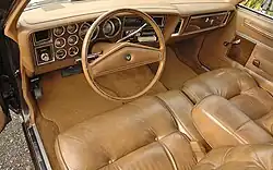 The Town & Country's grille insert and wheel covers for this new generation were from the New Yorker, while front seating choices and interior trim were again drawn from the Newport Custom. The new instrument panel featured a symmetrical padded loop echoing the design theme of the front end. The inverted fan style speedometer from 1967 and 1968 continued, balanced on the passenger side by a large glove box door. A unique Chrysler feature was floodlighting of the instruments and controls instead of more typical backlighting.[7]