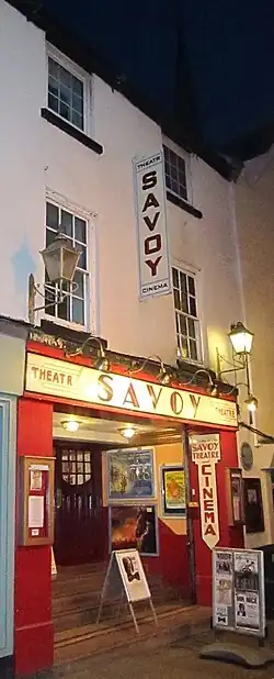 The Savoy Theatre is a Grade II* listed building, which was refurbished in 1928 in traditional style, and is reputedly the oldest working theatre site in Wales. The building in which the theatre is housed was constructed on the foundations of the earlier Bell Inn, and was first granted an entertainment licence in 1832. It became Monmouth's first cinema, the "Living Picture Palace and Rinkeries", in 1910, before being rebuilt by the Albany Ward theatre group.[8] It closed as a cinema in the 1980s, later reopening as a bingo hall and again closing in 1983, before reopening for a time to show historic magic lantern slides.[9] It has operated continuously as a cinema since the 1990s and is now run by a charitable trust.[10]