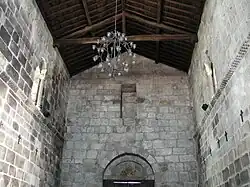 The interior nave is circled by frieze, with four slits flanked by columns and capitals, decorated with vegetal and geometric shapes over archways. The frontispiece likely included slits, with vestiges clearly visible in the interior.[1] Over the axial portico is a double archivolt and tympanum with the cord of Solomon, surmounted by a covered slit or niche, and the ceiling is covered in wood.[1] The triumphal archway to the presbytery is decorated by lions and leaves, columnar capitals and sculpted race, flanked by two frescoes representing Martírio de São Sebastião (Martyr of St. Sebastian) and Virgem de pé, com o Menino nos braços (Virgin Mary and Child). Above these features in the gabled-end is a sculpted Rosetta window.[1]