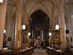 The interior of the church is built as three-aisles, the main nave is followed by a chancel, which has a polygonal pentagonal closing. The side aisles end in short rectangular closings. The three aisles of the temple and the presbytery are topped by cross ribbed vaults. The closing of the chancel has a radial vault. The ribs are carved in a decorative shape, with slightly bevelled edges, and joined in the flat circular keystones at the apex of the vault.