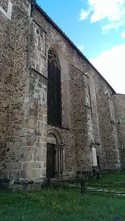 The main entrance to the church is through a portal, which is from the early gothic period. There are slender columns with crowded plate pedestals in the corners, topped with shaped capitals. Tympanum is smooth, lined with multiple archivolts. Few smaller portals are similarly conceived, preserved also in the northern and southern walls of the church. The northern portal columns are decorated with folk decor and perhaps with grapes, compared to the other portals.